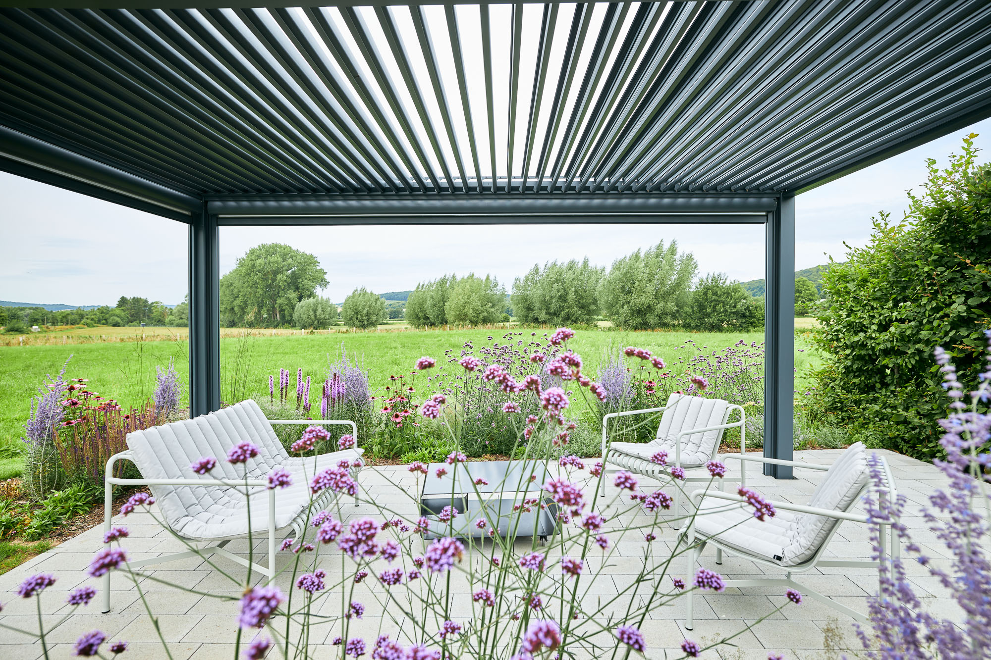 Mit der Coral 100 holen Sie das Maximum aus Einfachheit heraus. Die manuell verstellbaren Lamellen lassen sich präzise um bis zu 90° einstellen – ganz bequem per Kurbel, stromfrei und sekundenschnell. Dazu überzeugt das Dach mit 100 % Regendichtigkeit und einem unsichtbar integrierten Wasserablaufsystem.