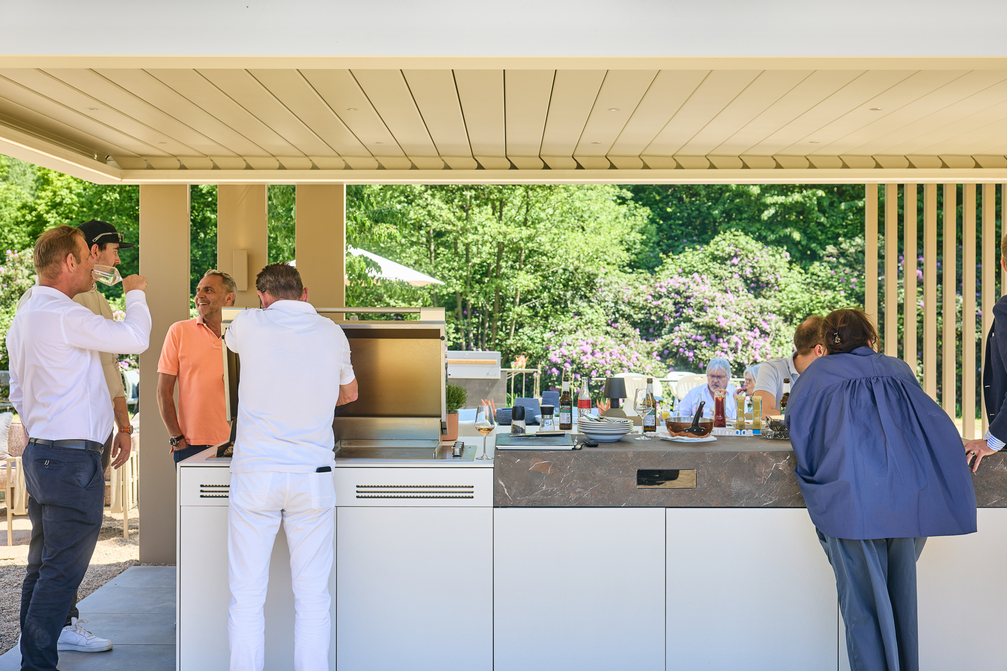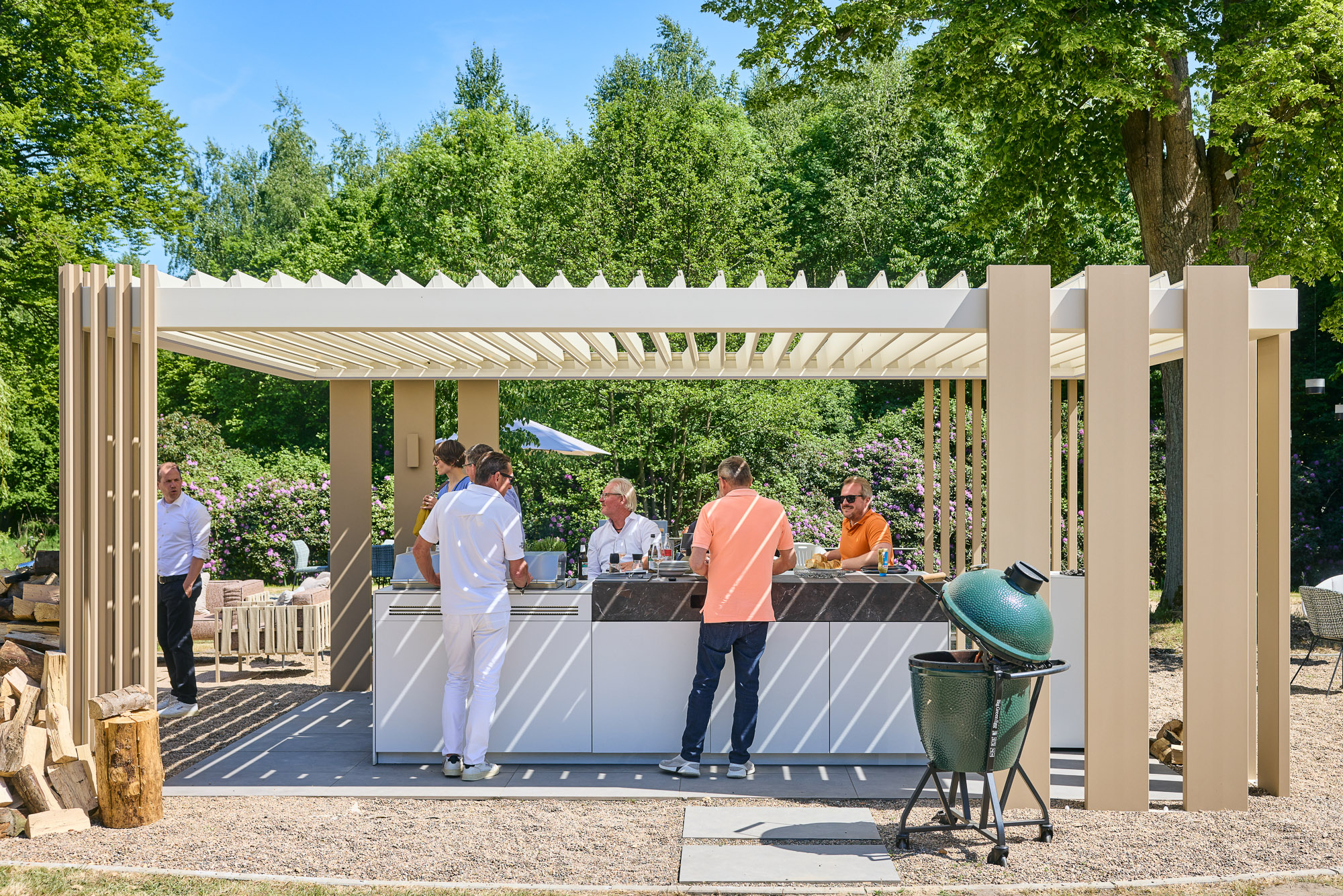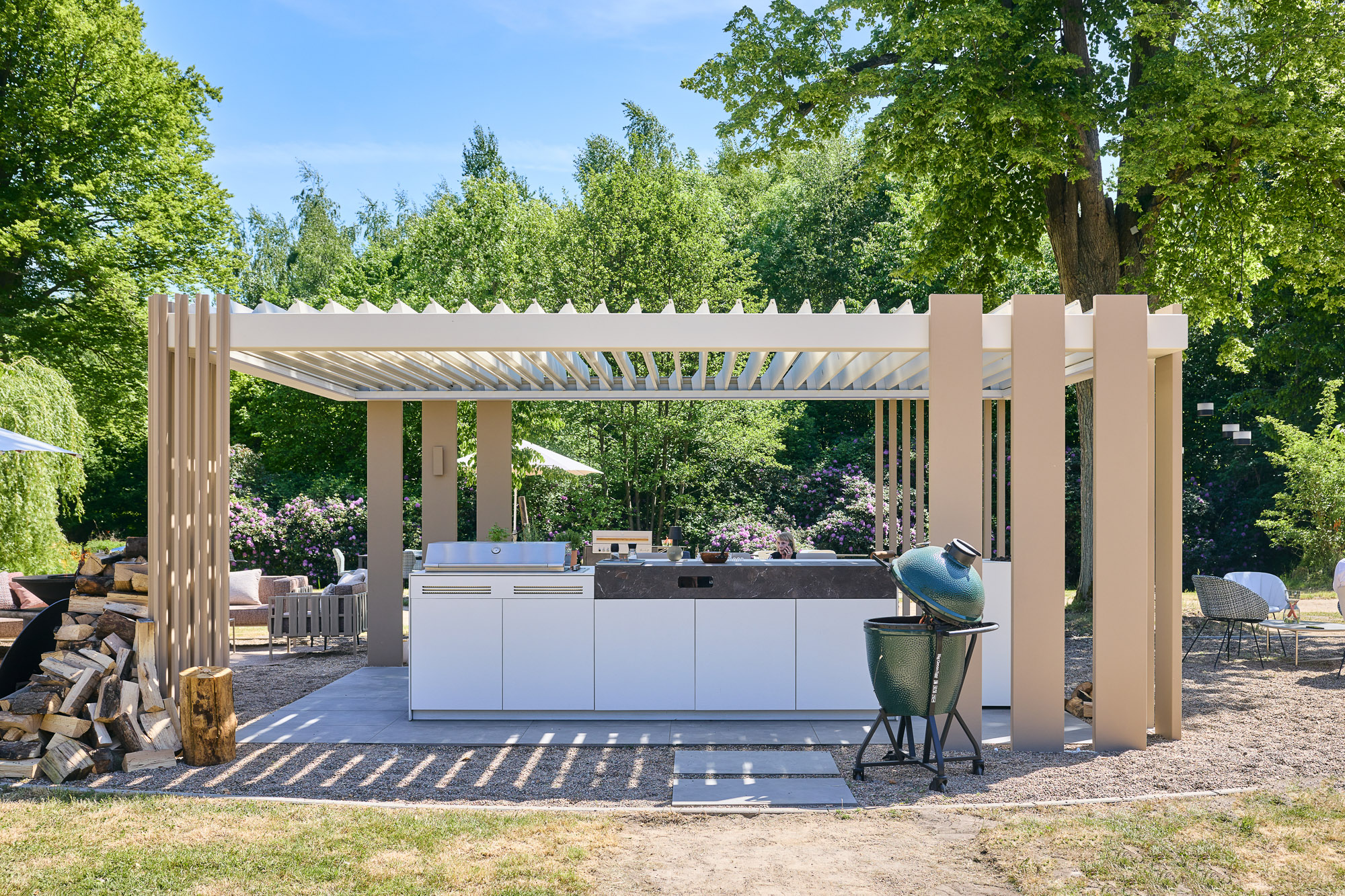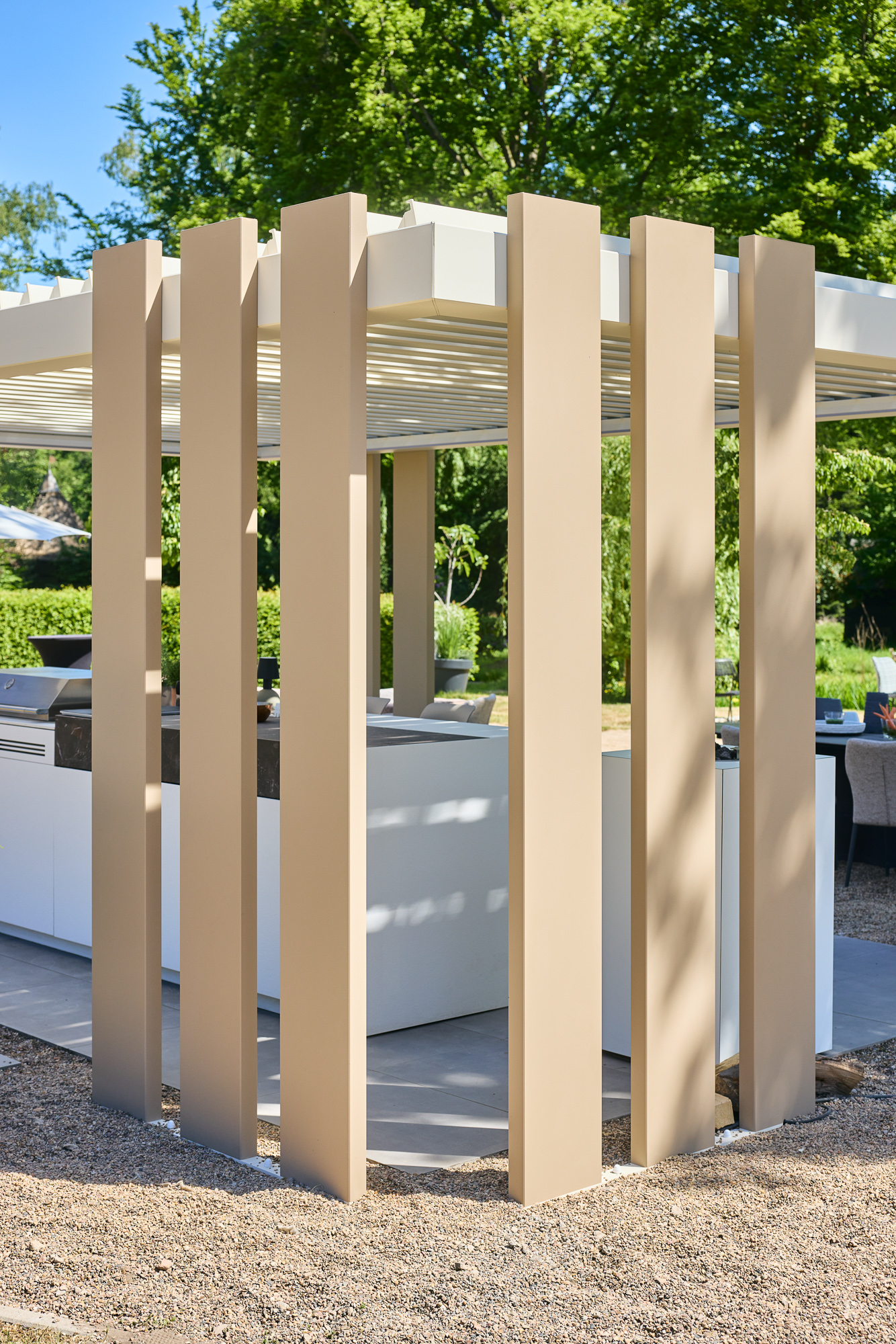 Die Antwort lieferte die Signature Collection (Modell Rubina 603). Hier zeigt INODEQ seine besondere Stärke: Die Fähigkeit, durch Modularität Architektur zu schaffen. Für dieses Projekt wurde bewusst ein Spiel mit den Dimensionen gewählt. Der Einsatz von massiven 300 mm Design-Stützen in Kombination mit filigraneren Elementen verleiht der Konstruktion eine fast monolithische Präsenz, die der Wucht des Schlosses standhält. Es ist keine fragile Überdachung, sondern ein statemantartiges Bauwerk, das sich in seiner Wertigkeit dem historischen Bestand anpasst.
