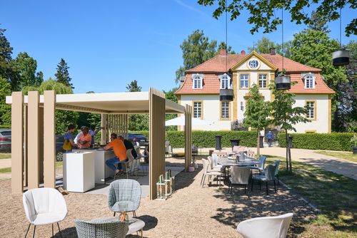 Einen Außenbereich für ein Designschloss zu gestalten, erfordert Fingerspitzengefühl. Die Herausforderung in Bosfeld lag nicht in der Technik, sondern in der Tonalität: Wie fügt man ein hochmodernes Element in ein historisches Ensemble ein, ohne dass es wie ein Fremdkörper wirkt? Gesucht war eine Brücke zwischen den Epochen – eine Ästhetik, die das „Klassische“ des Schlosses würdigt, aber mit einer selbstbewussten, modernen Formensprache antwortet. Besonders die Farbgebung spielte eine zentrale Rolle, um eine harmonische Einheit mit der Schlossfassade zu bilden.