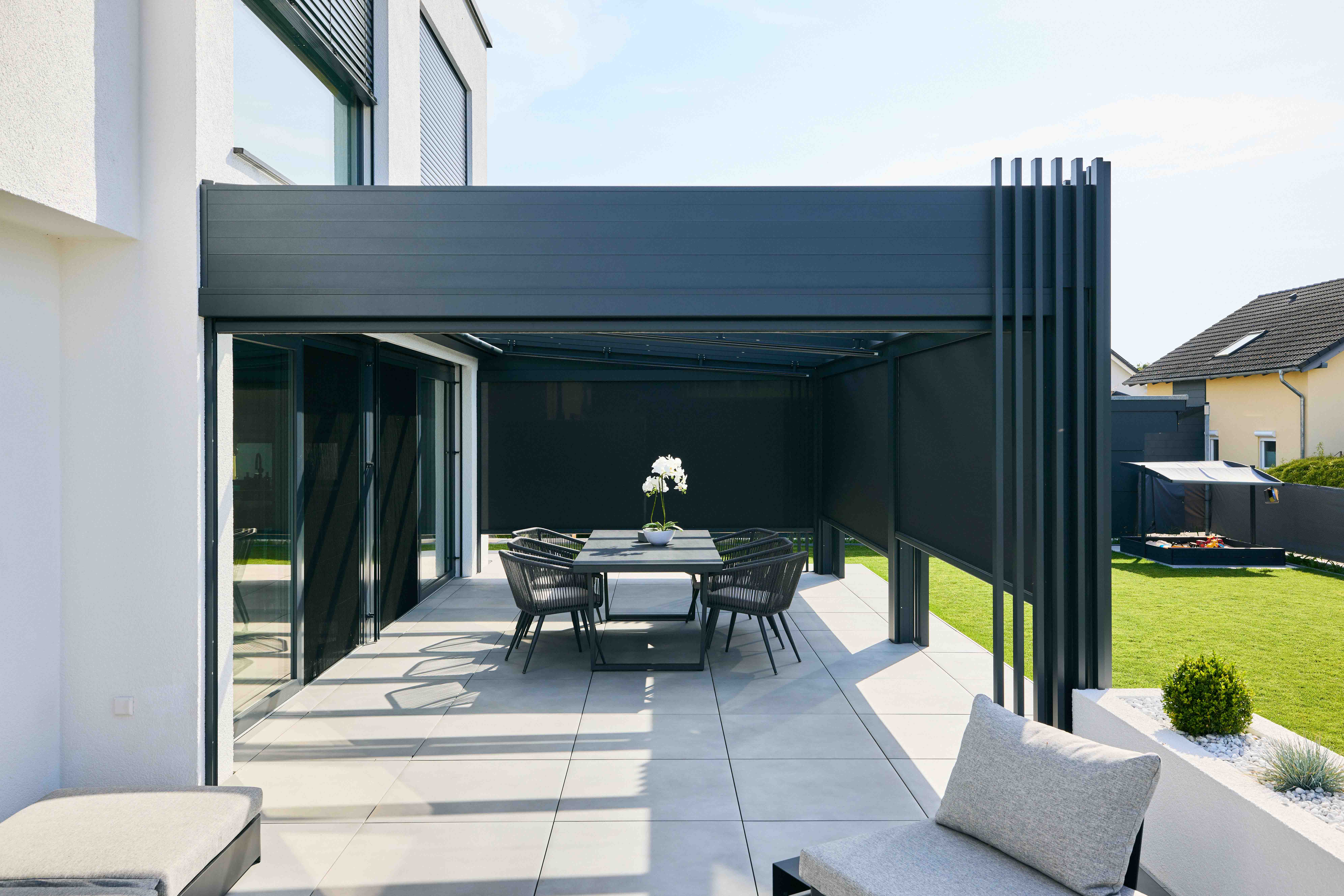 Die Kombination aus Glas und Markisen bietet eine Lösung, die nicht nur optisch besticht, sondern auch höchsten Komfort bietet. Die Markisen sind per Fernbedienung steuerbar und ermöglichen eine individuelle Anpassung des Schattenbedarfs. Die Glaspergola bleibt dabei stets ein elegantes Element im Garten, das für lichtdurchflutete Tage und gemütliche Stunden im Freien sorgt. Die moderne Gestaltung und die klaren Linien der Konstruktion machen die Glaspergola zu einem wahren Highlight, das sich harmonisch in den Außenbereich einfügt und das Leben im Freien auf ein neues Niveau hebt.