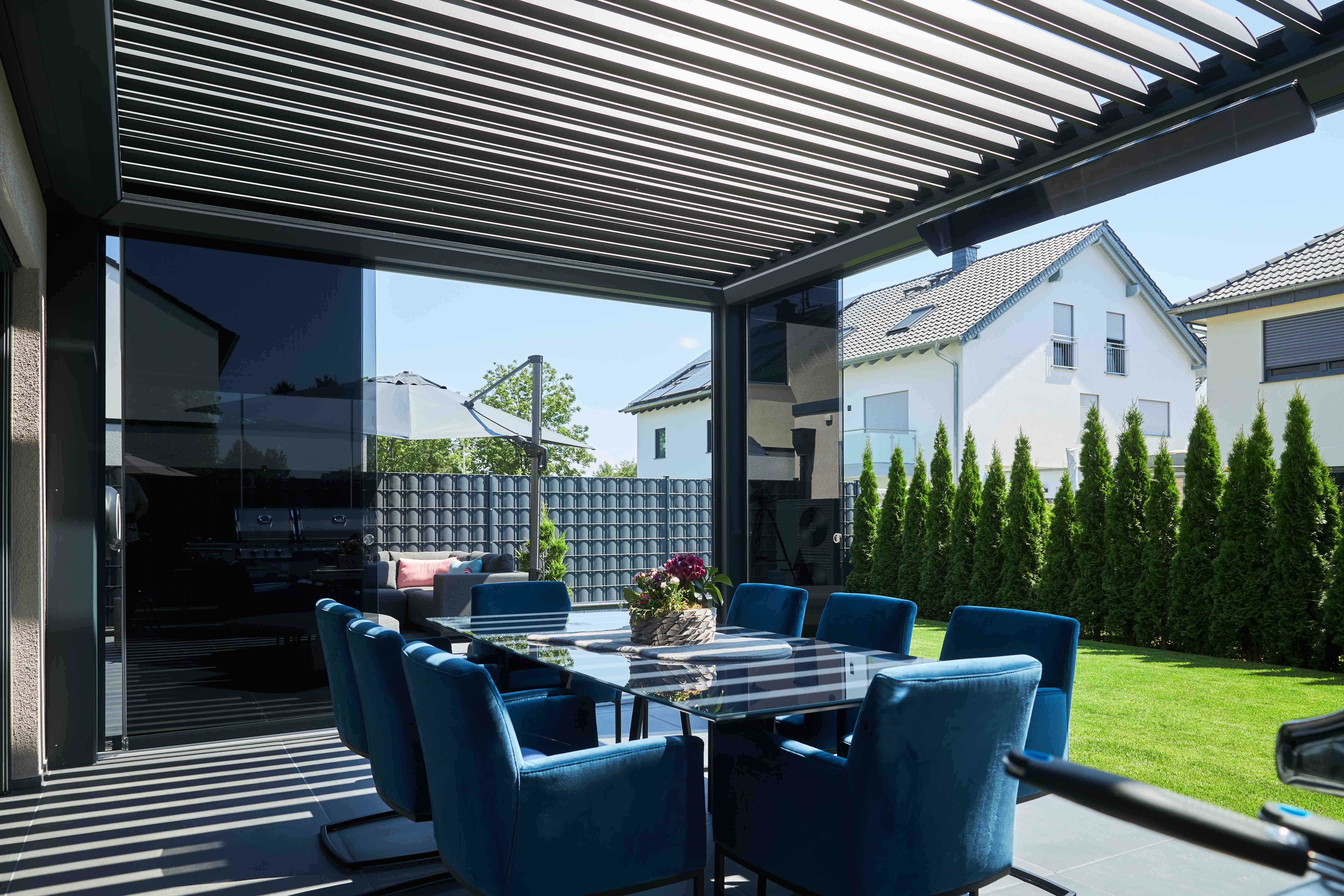 Die neue Gartenlounge ermöglicht es der Familie, den Außenbereich unabhängig von den Jahreszeiten optimal zu nutzen. Das Lamellendach schützt zuverlässig vor Sonne, Regen, Wind und kühleren Temperaturen und sorgt so ganzjährig für ein angenehmes Klima. Die integrierten Schiebegläser bieten zusätzlichen Schutz, während die ZIP-Markisen für Schatten und Privatsphäre sorgen. Ob für gemütliche Abendessen an lauen Sommerabenden oder entspannte Nachmittage im Winter – die Gartenlounge schafft stets die passende Atmosphäre und höchsten Komfort.