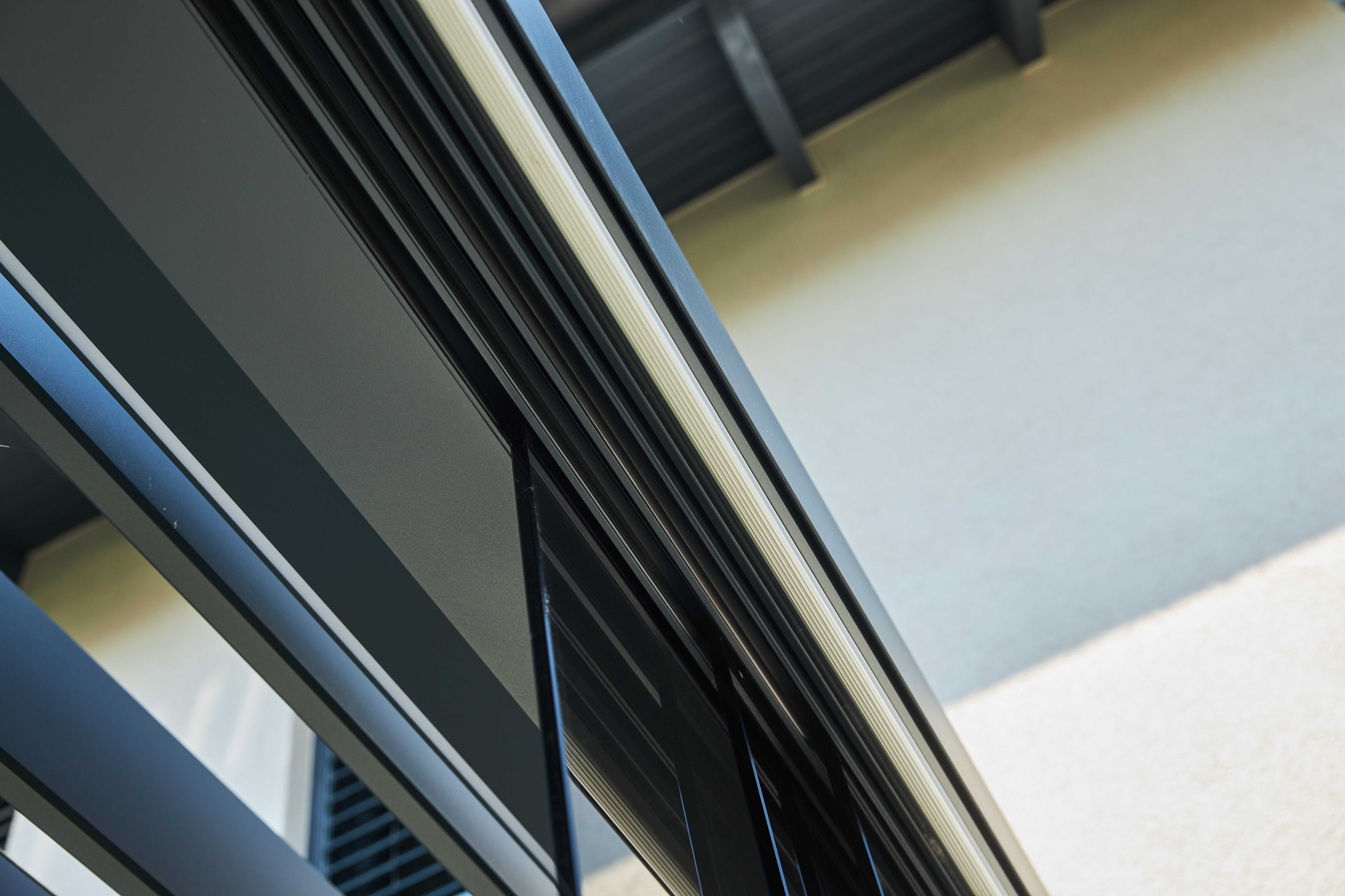 Das Lamellendach fügt sich harmonisch in die moderne Architektur des Hauses ein und erweitert den Wohnraum um einen eleganten, lichtdurchfluteten Bereich. Die Lamellen sind bis zu 140 Grad verstellbar, wodurch der Lichteinfall präzise reguliert werden kann – von vollem Sonnenlicht bis zu angenehmem Schatten, passend zu jeder Tageszeit und Stimmung. Das innovative Stützen- und Rahmensystem des Diamond-Lamellendachs sorgt dafür, dass das ästhetische Design trotz der Integration von Schiebegläsern und ZIP-Markisen erhalten bleibt. Dies verleiht dem gesamten Ensemble eine elegante Leichtigkeit und macht den Übergang von Innen- zu Außenbereich nahezu unsichtbar.