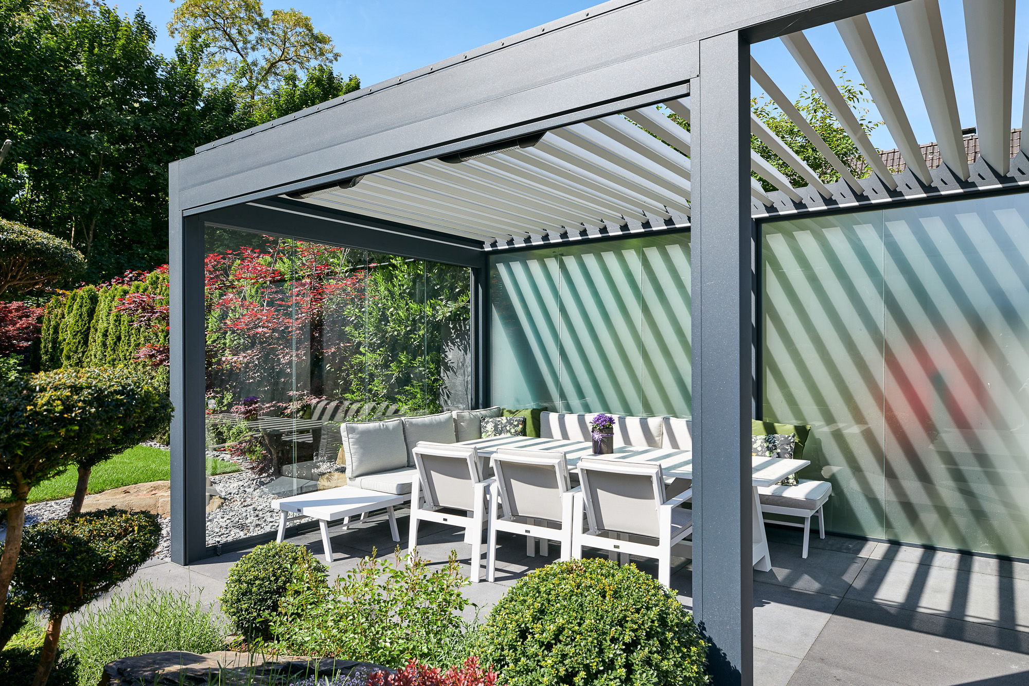 Une retraite élégante au milieu d'un jardin paradisiaque détaillé, protégé, structuré et pourtant totalement ouvert à la lumière, à l'air et à la vie. La vision de ce projet était de créer une transition harmonieuse entre une architecture claire et la diversité naturelle. Avec la pergola autoportante Toscana 400, un espace a été créé qui combine le meilleur des deux mondes : design minimaliste et environnement organique. Le complexe indépendant d'un élégant gris anthracite se présente comme le centre sculptural d'un jardin exceptionnellement bien entretenu. La teinte a été délibérément choisie pour contraster avec les riches nuances de vert et les accents de couleur ciblés, tels que les azalées, les érables et les bonsaïs. Les lamelles horizontales d'un blanc doux reprennent les couleurs vives du mobilier de jardin et créent un jeu de lumière passionnant sur le sol, le verre et les meubles.