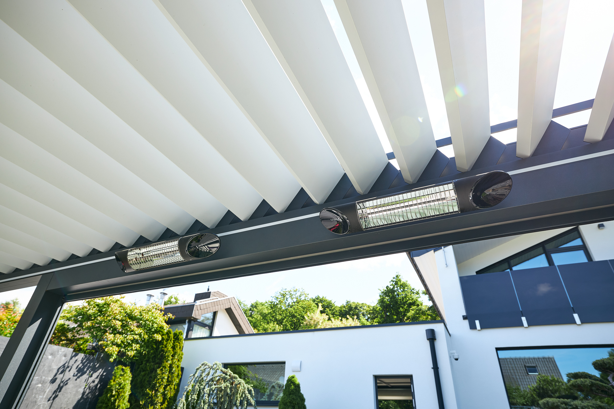 Équipée de parois vitrées coulissantes intégrées ainsi que de vitrages fixes supplémentaires et de stores zippés, la pièce peut être adaptée de manière flexible à toutes les conditions météorologiques, sans perdre en transparence ni en légèreté. Les lamelles pivotantes entièrement automatiques permettent de contrôler de manière ciblée la circulation de la lumière et de l'air, grâce à un élégant système d'éclairage LED et à deux radiateurs intégrés pour les soirées plus fraîches.